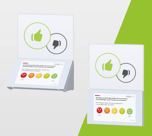 Feedbackterminals müssen dort sein, wo Ihre Kunden sich aufhalten. Individuelle Produktlösungen sind für uns selbstverständlich. An der Wand, auf dem Boden, auf dem Tisch, am Messestand oder als mobiles Gerät in der Hand – hier finden Sie das Feedback Terminal- System, was optimal zu Ihrem Einsatzzweck passt – und zur Customer-Journey Ihrer Kunden.